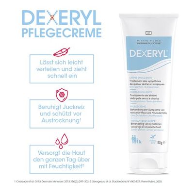 DEXERYL ist die medizinische Intensivpflege bei Hautkrankheiten wie Ichthyosis, Psoriasis und Neurodermitis und für die anspruchsvolle, trockene Haut von Diabetikern und Dialysepatienten. Außerdem bietet sie optimalen Schutz für trockene Haut – ob durch Veranlagung oder durch die Witterung.