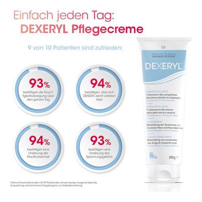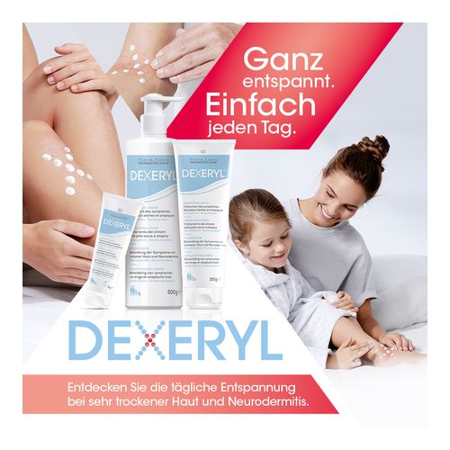 DEXERYL ist die medizinische Intensivpflege bei Hautkrankheiten wie Ichthyosis, Psoriasis und Neurodermitis und für die anspruchsvolle, trockene Haut von Diabetikern und Dialysepatienten. Außerdem bietet sie optimalen Schutz für trockene Haut – ob durch Veranlagung oder durch die Witterung. Cremen Sie einfach Gesicht und Körper ein- bis zweimal täglich, bei Bedarf auch häufiger, mit DEXERYL ein.