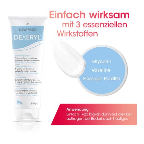 Die Wirkstoffe in DEXERYL stehen in einem ganz besonderen, ausgewogenen Verhältnis zueinander, so dass DEXERYL die Feuchtigkeit in der Haut bindet, die Hautelastizität verbessert, gleichzeitig einen schützenden Film auf der Haut bildet ,der rückfettend wirkt. DEXERYL wird nach den hohen Qualitätsstandards eines Arzneimittels hergestellt und enthält nur eine minimale Anzahl an Inhaltsstoffen. Insbesondere wird bewusst auf Duftstoffe und Lanolin (Wollwachs) verzichtet.