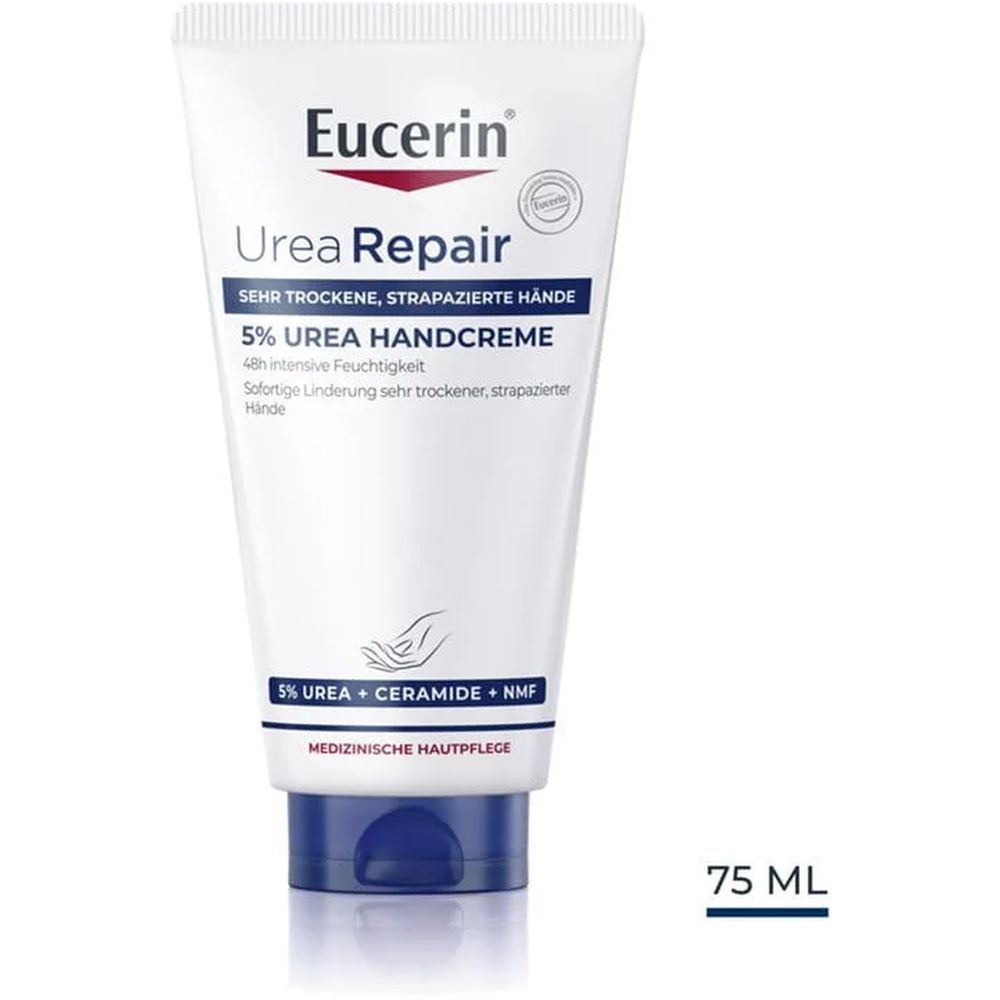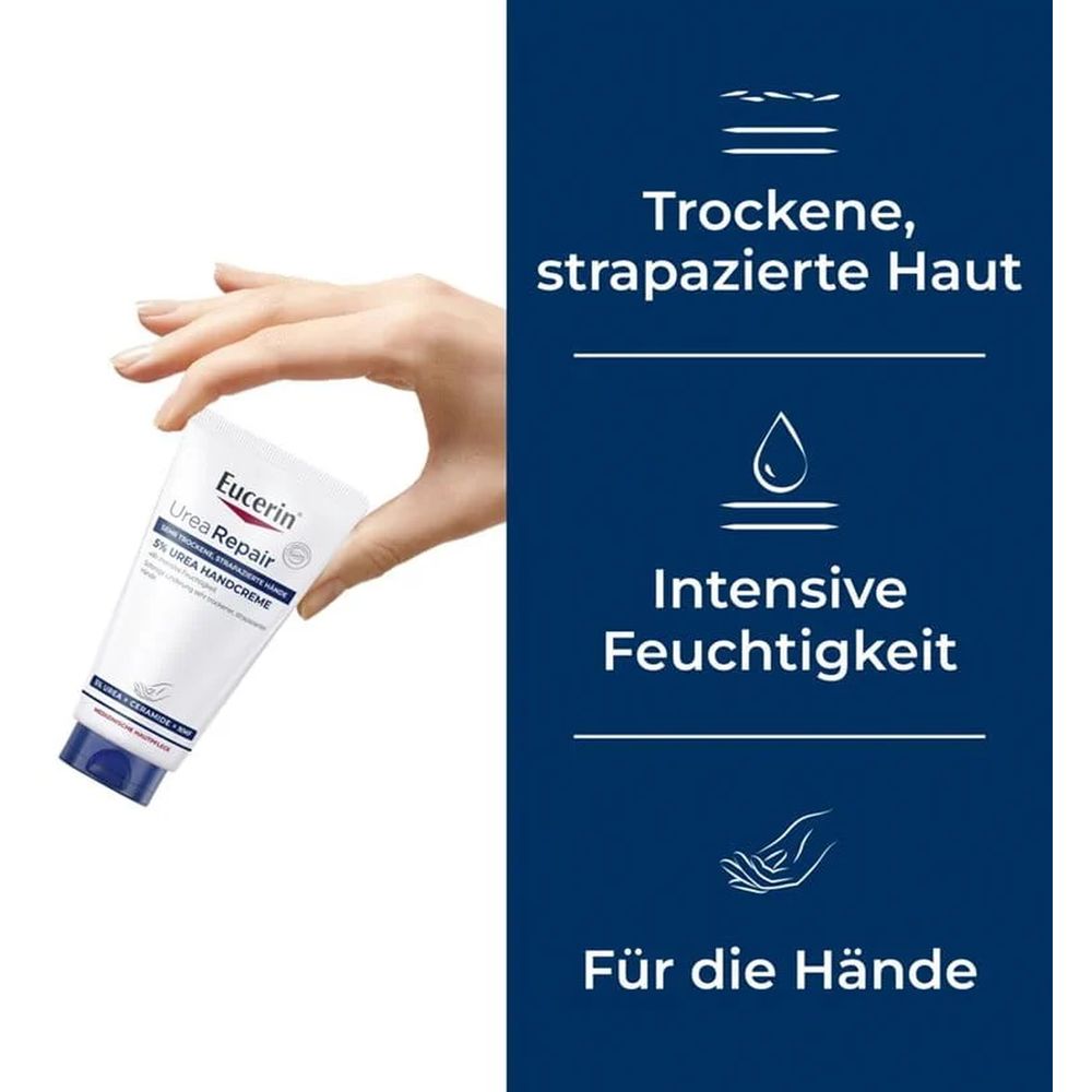 Die Hände sind viel häufiger kaltem Wetter, Wasser, Seife oder anderen Irritantien ausgesetzt als der übrige Körper. Dadurch ist die Haut hier wesentlich anfälliger für Trockenheit, Rötungen, Juckreiz und Irritationen. Eine stabile Barrierefunktion schützt uns vor diesen äußeren Faktoren und hält die Haut mit Feuchtigkeit versorgt. Wenn die Hautbarriere beeinträchtigt ist, kann die Haut Feuchtigkeit verlieren und die Hände können trocken und rau aussehen und sich auch so anfühlen. Die Eucerin UreaRepair 5% Urea Handcreme versorgt trockene, raue Hände mit der täglichen Pflege die sie benötigen. Die einzigartige Formel enthält 5% Urea + Ceramide + Natural Moisturizers - die die Feuchtigkeit in der Haut binden und die natürliche Schutzbarriere der Haut reparieren, um weiteren Feuchtigkeitsverlust zu verhindern. Es ist klinisch und dermatologisch nachgewiesen, dass die Formel sowohl sofortige Linderung als auch intensive, langanhaltende Feuchtigkeit für trockene, raue Hände bietet, selbst nach wiederholtem Händewaschen. Sie stärkt die natürliche Hautbarriere und macht die Haut bis zu 48 Stunden lang widerstandsfähig gegen Trockenheit. Die Handcreme mit Urea eignet sich für alle Hauttypen mit trockenen Händen, einschließlich alternder Haut und Hautzuständen wie Xerosis, Psoriasis und Diabetes. Sie kann auch als therapiebegleitende Pflege verwendet werden.